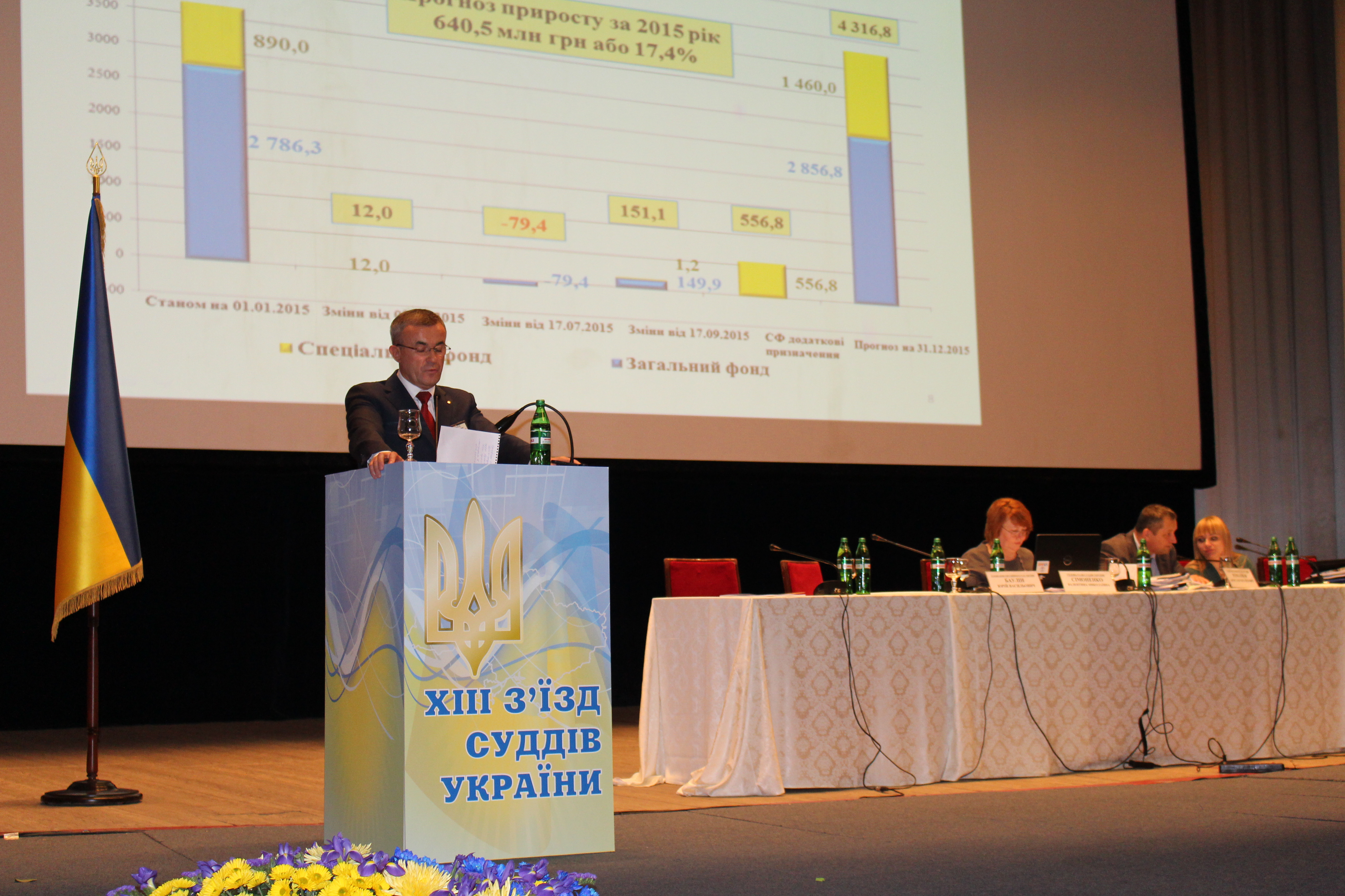 Коротко про фінансове забезпечення. Загальна сума бюджетних призначень на забезпечення діяльності органів судової влади України, що затверджена законом про державний бюджет, на початок 2015 року становила 3 млрд 676 млн грн, а на кінець року з урахуванням понадпланових надходжень, що очікуються до кінця року, становитиме 4 млрд 317 млн грн, з них надходження із джерел загального фонду становлять 2 млрд 857 млн грн, прогноз спеціального фонду – 1 млрд 460 млн гривень.
