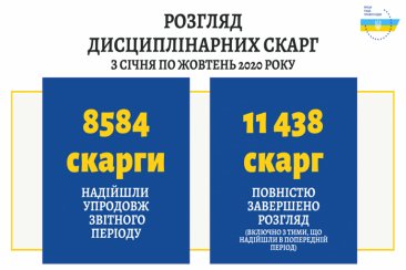 Протягом січня – жовтня 2020 року до Вищої ради правосуддя надійшло 8584 скарги щодо дисциплінарного проступку судді (за аналогічний період 2019 року – 8106 скарги).