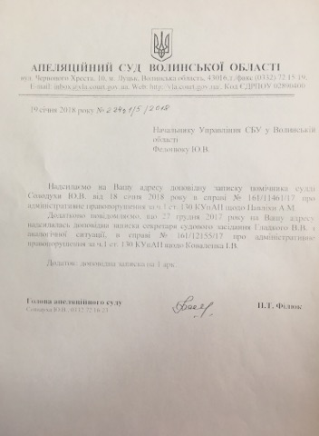 Щодо двох таких випадків головою Апеляційного суду Волинської області уже проінформовано Управління Служби безпеки України у Волинській області (копії долучаємо).