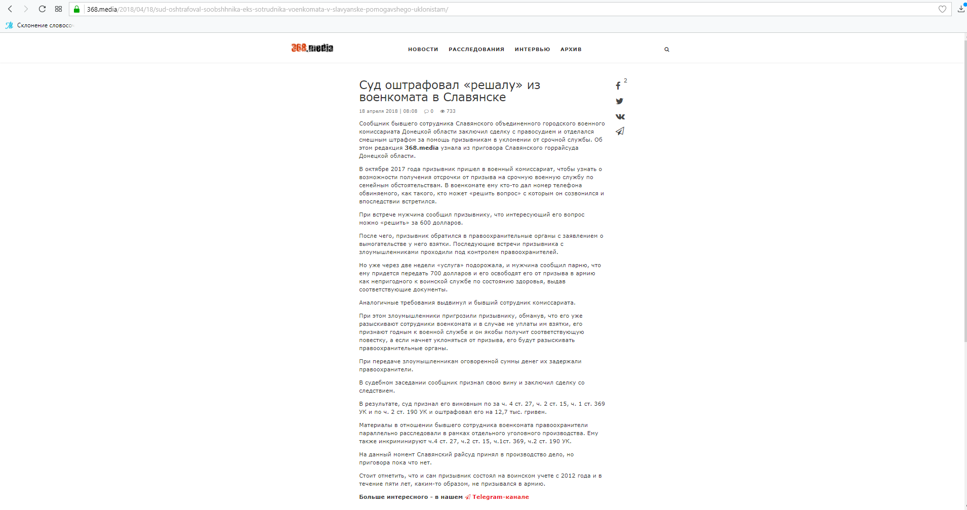 18 квітня 2018 року на інформресурсі 368.media (https://368.media/2018/04/18/sud-oshtrafoval-soobshhnika-eks-sotrudnika-voenkomata-v-slavyanske-pomogavshego-uklonistam/) було розміщено статтю під назвою, мовою оригіналу,: «Суд оштрафовал «решалу» из военкомата в Славянске».