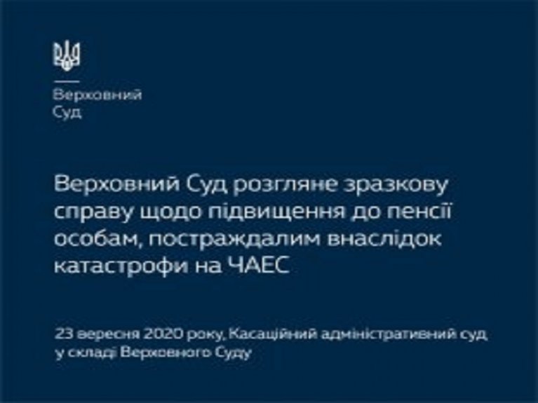 23 вересня 2020 року Верховний Суд у складі колегії суддів Касаційного адміністративного суду розгляне зразкову справу за позовом особи до територіального органу Пенсійного фонду України щодо відмови у нарахуванні та виплаті підвищення до пенсії пенсіонеру (позивачу), який проживає на території зони посиленого радіоекологічного контролю.